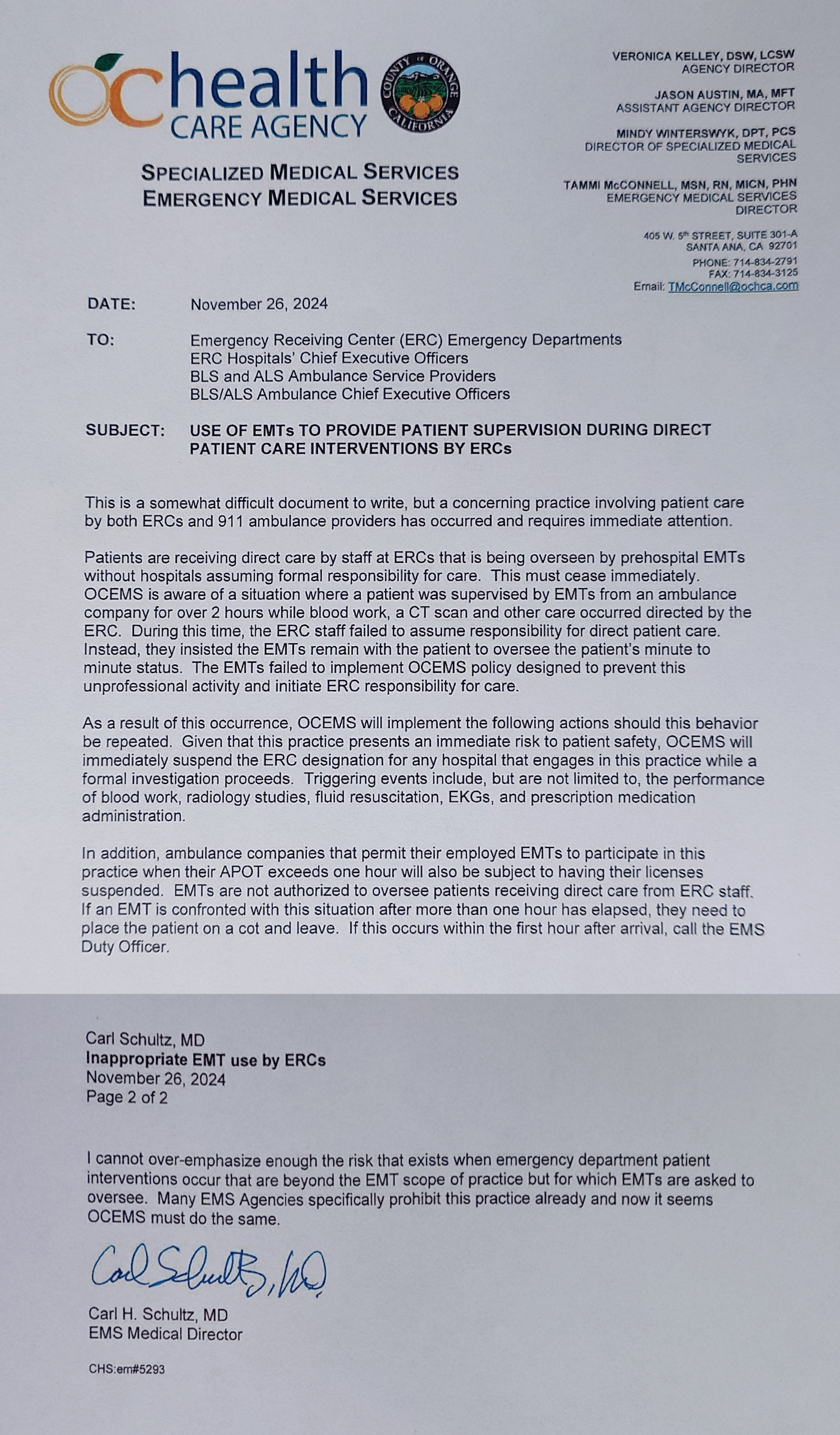A letter from OCEMS clarifying that no hospital care can be performed while a pt is on a gurney; they must be transferred to a bed first. Penalties for all parties involved (hospital, EMTs, and ambulance company - not the pt) are severe.